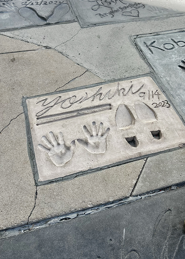 入り口で建物と写真撮影などを楽しんでいると、わりとすぐにYOSHIKIさんの手形と足形を見つけることが出来ました。
